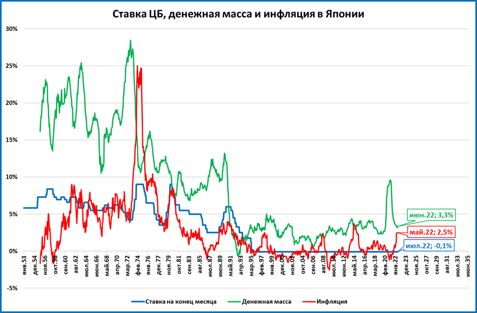 Инфляция в Японии (2,5%, см. график 2) намного ниже чем в США (9,1%) или в Еврозоне (8,6%). Но деньги растут настолько медленно, что рост денежной массы в реальном выражении практически прекратился.