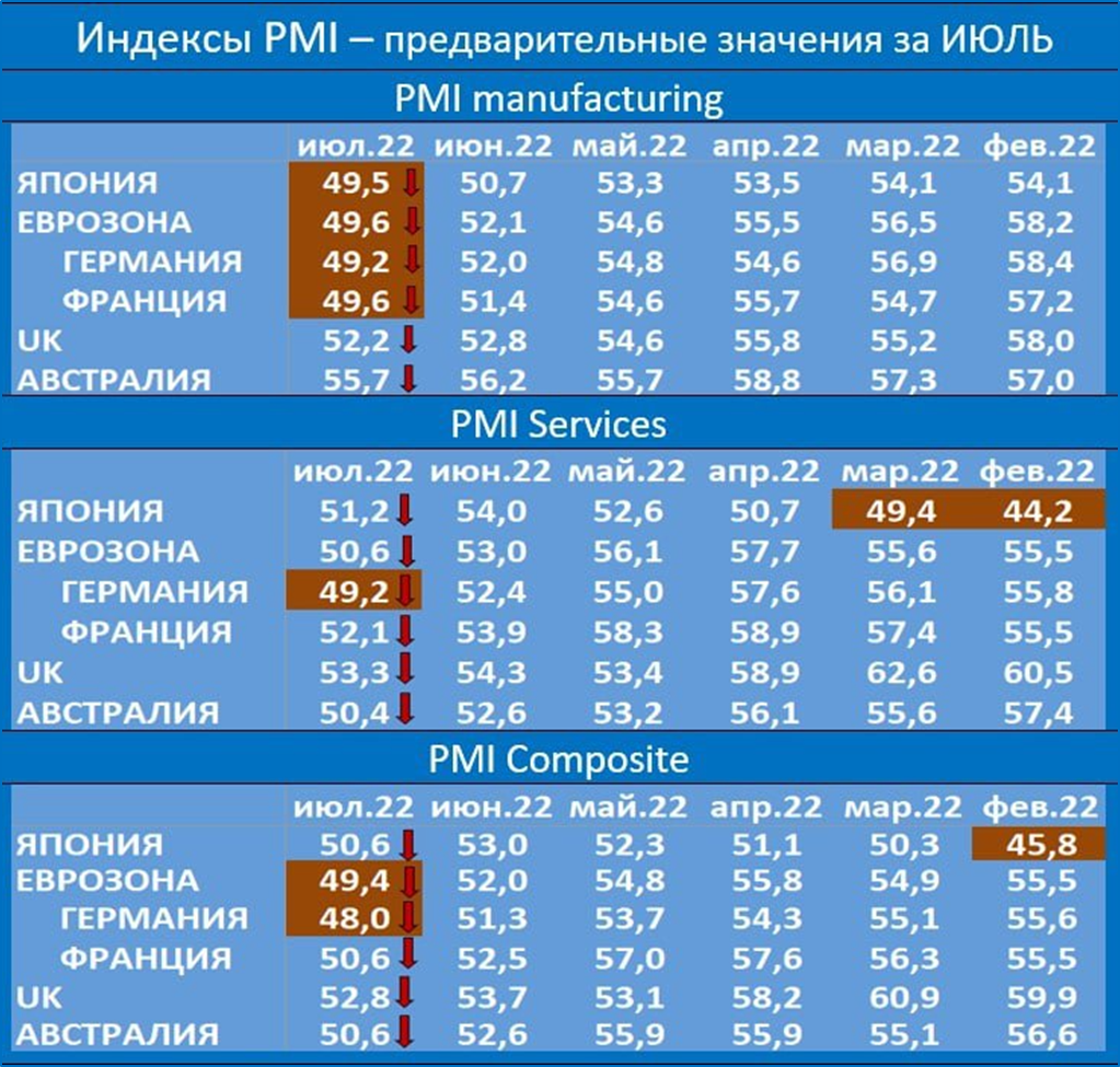 ● На этом фоне индексы PMI в Японии и Еврозоне показывают снижение. Вал негативных новостей будет только нарастать.