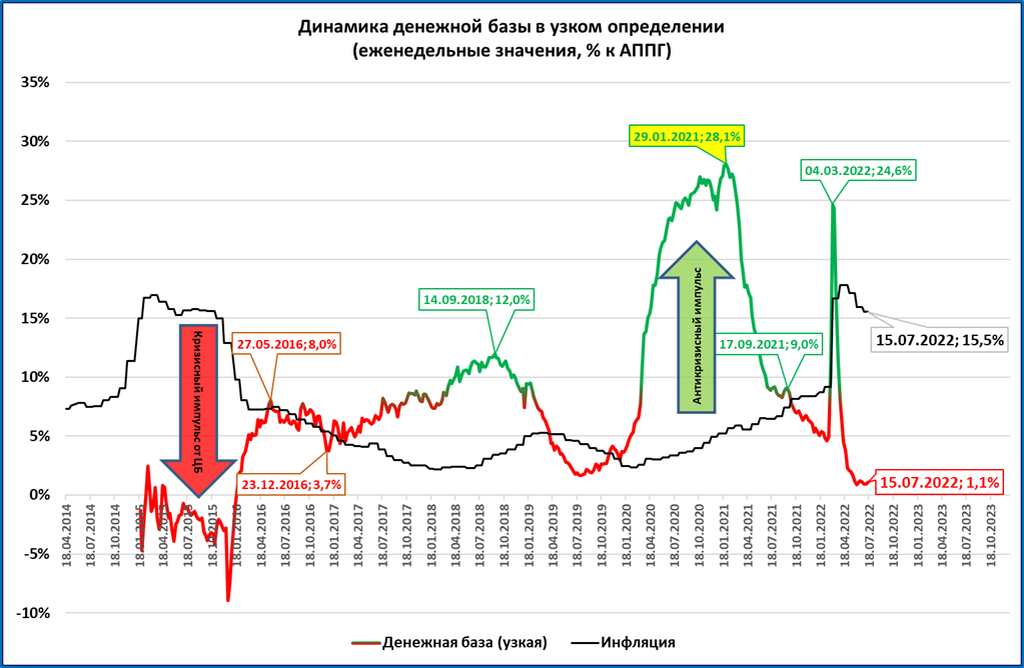 При этом инфляция сейчас выше темпов роста денежной массы (зелёная линия на графике ниже красной). Это означает, что в реальном выражении денежная масса сокращается.