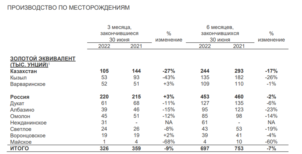 В первой половине 2022 года производство в золотом эквиваленте снизилось на 7% г/г, составив 697 тыс. унций в золотом эквиваленте. Из-за ограничений, введенных Китаем в связи с COVID, Полиметалл был вынужден сократить отгрузку золотого концентрата с Нежданинского и Кызыла.