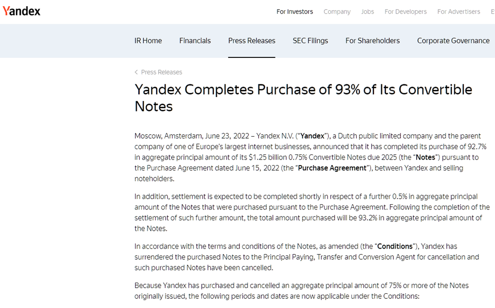 Кстати, одной из последних новостей было то, что Яндекс выкупил 93% своих конвертируемых облигаций на 1,25 млрд $, из-за которых весной мог быть объявлен технический дефолт.