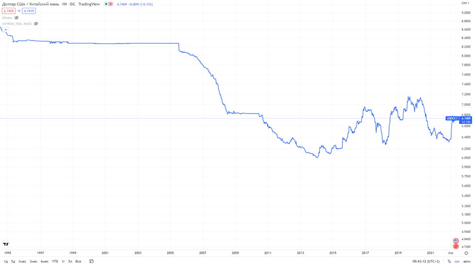 Почему так происходит? Потому что юань уже несколько десятилетий торгуется довольно в узком диапазоне относительно доллара. За последние 25 лет он даже укрепился к доллару.