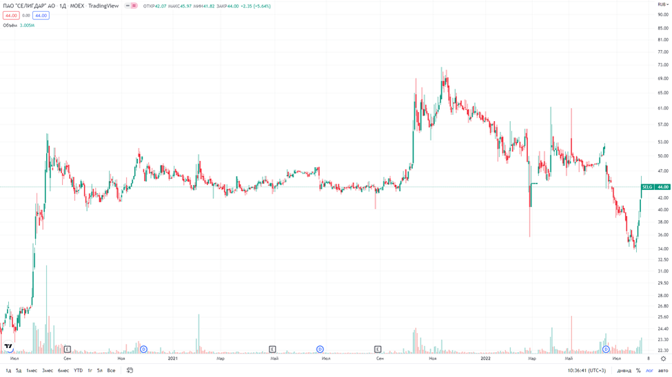 В конце июня 2022 года, Селигдар выплатил дивиденды за 2021 год в размере 4.5 рубля на акцию. К текущей цене акции – это примерно 10%.