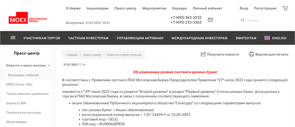 В первую очередь, это было связано с включением Мосбиржей акций Селигдара в первый уровень котировального списка. Это действительно большой позитив, т.к. Первый уровень - бумаги наивысшей надежности. Например, пенсионные фонды и страховые компании имеют право покупать бумаги только из котировального списка первого уровня. Поэтому спрос на акции увеличился, цена резко выросла.