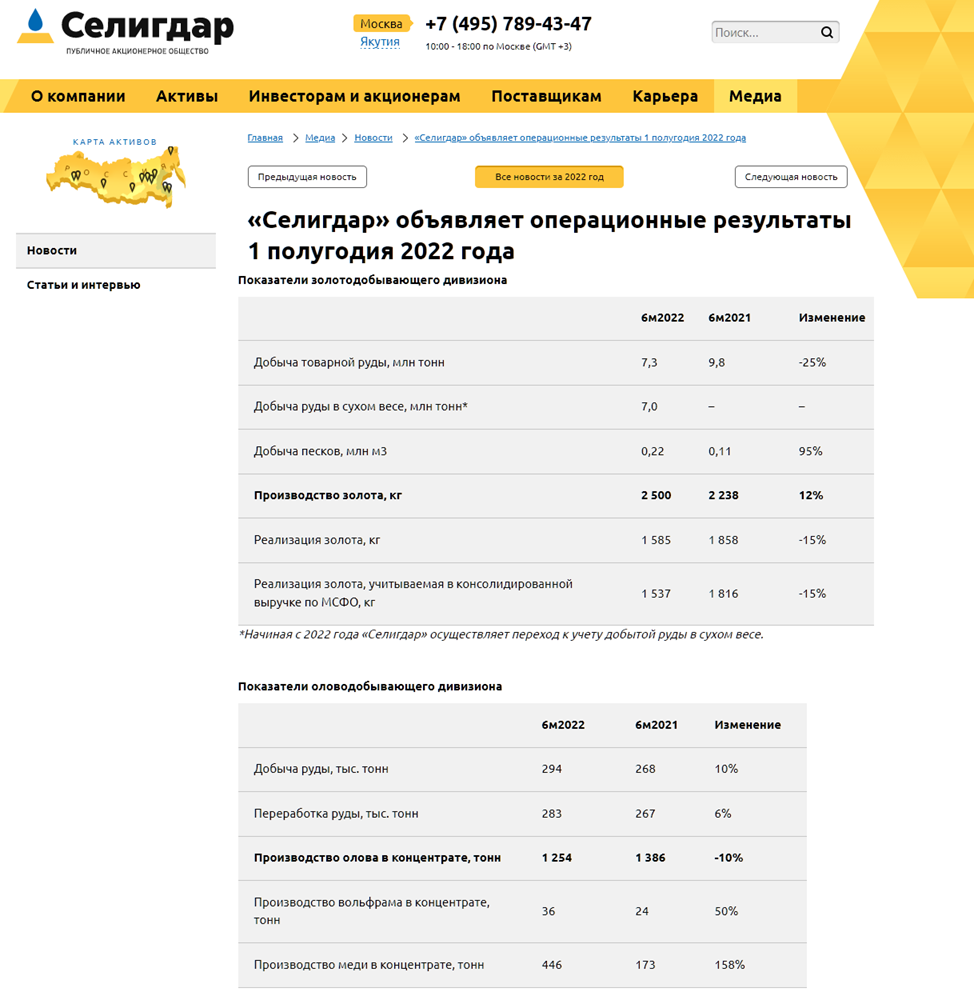 20.07.22 ПАО «Селигдар» объявил умеренно позитивные производственные результаты 1 полугодия 2022 года по данным оперативного учета. Производство золота компаниями Холдинга составило 2 500 кг (рост на 12% г/г), но упала добыча на 25%, а продажи снизились на 15%.
