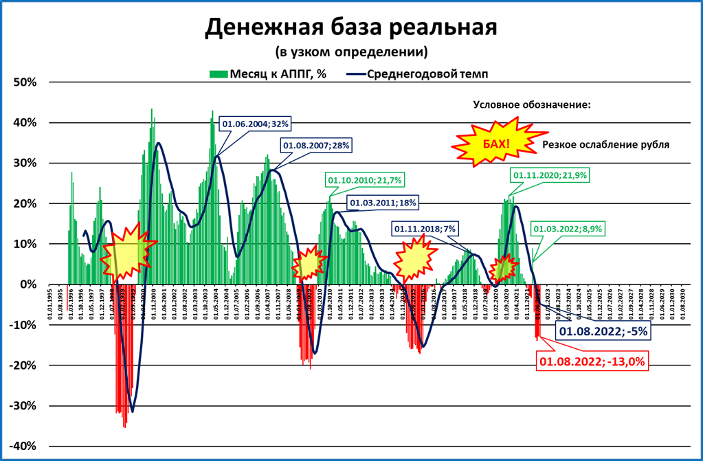 Напомним, что денежная база – показатель полностью подконтрольный Центральному банку, как и инфляция, на которую надо делать поправку при переходе к реальной денежной базе.