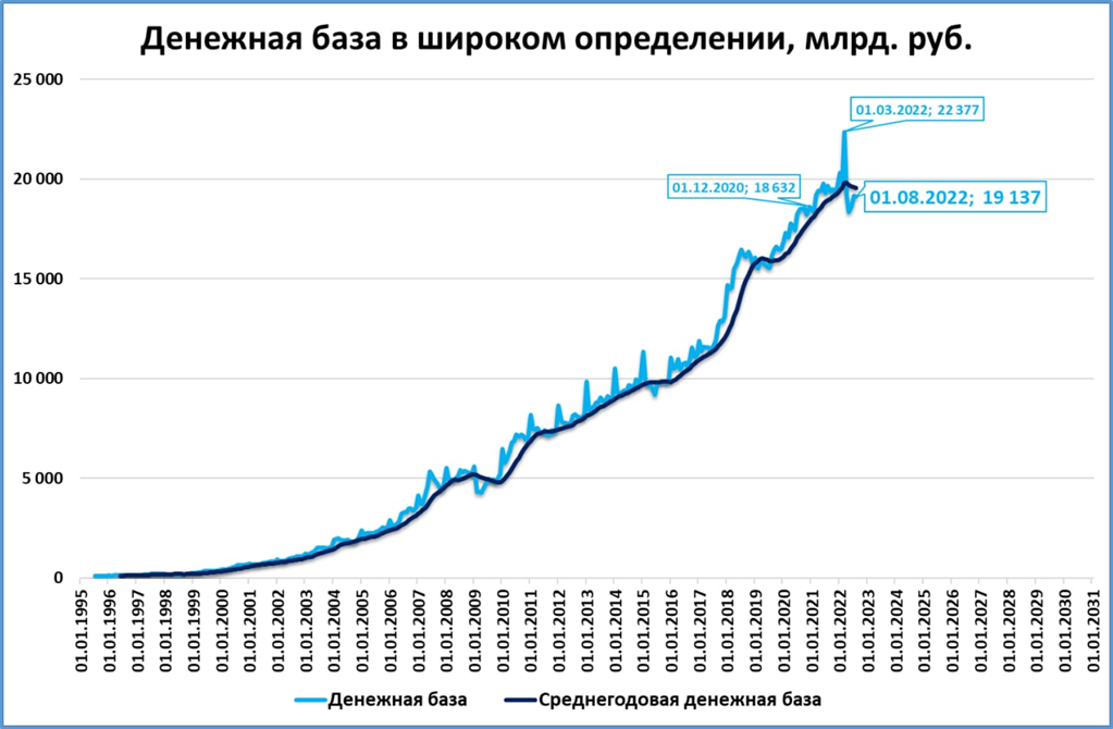 Денежная база (ДБ) на 1 августа 19,1 трлн. рублей.