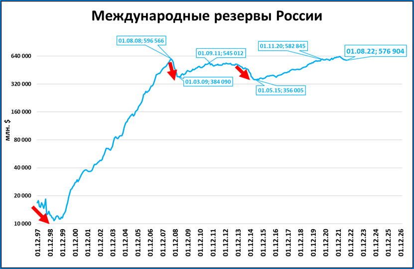 Более наглядно падения ЗВР (в т.ч. в конце 1990-х) видны на графике с логарифмической шкалой.