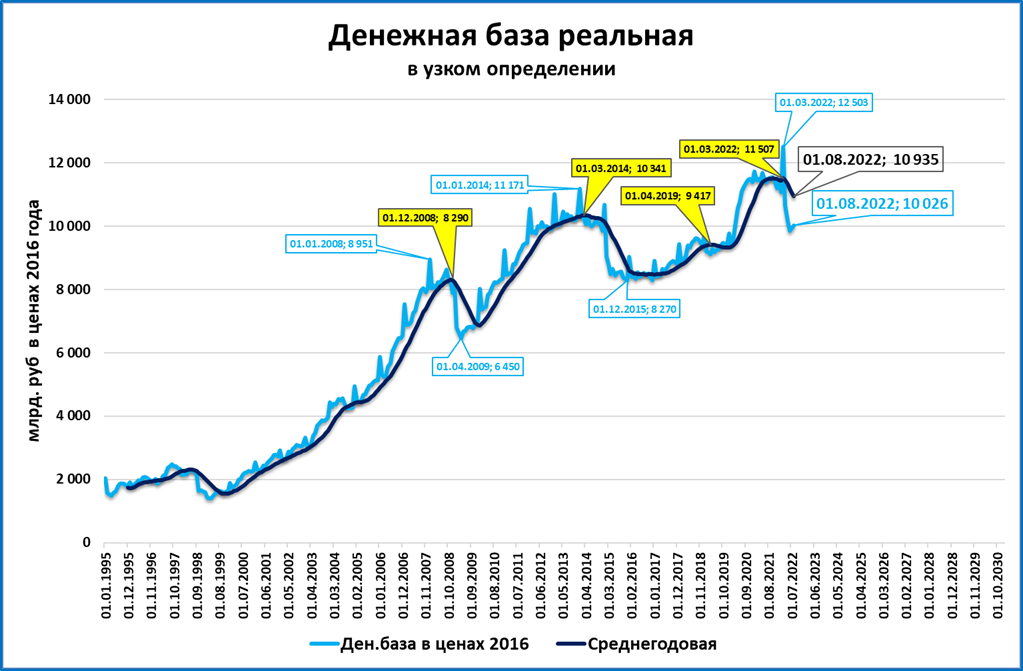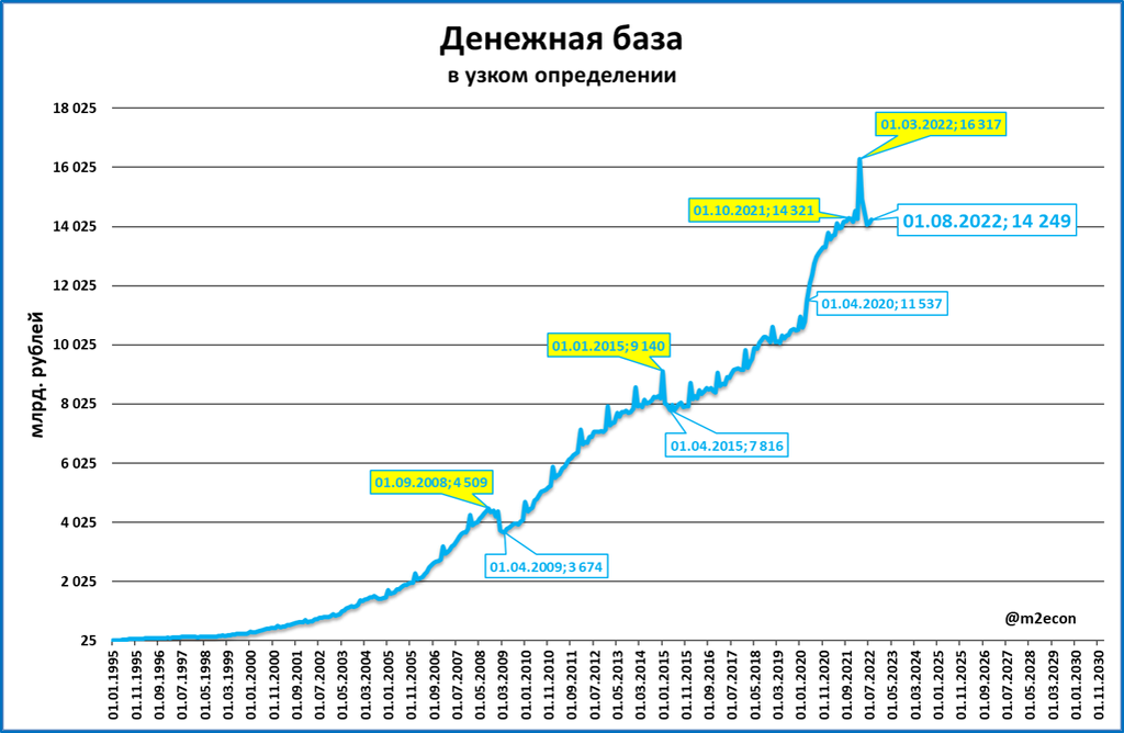 За 14 с лишним лет (с янв.2008) УДБ в реальном выражении выросла на жалкие 10% (с 9 до 10 трлн в ценах 2016 года). См. также статистику широкой денежной базы выше.