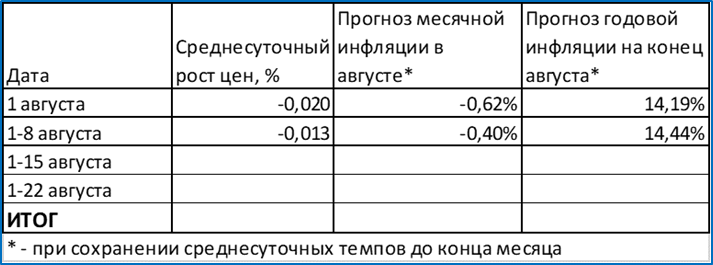Если среднесуточный рост цен первых восьми дней сохранится до конца месяца, то по итогам августа инфляция опустится до 14,4% годовых.