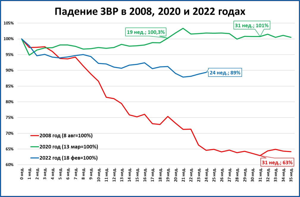 Падение ЗВР может быть не опасным. Если ЗВР сокращаются, но это не связано с сокращением рублёвой денежной массы, то это не опасно. Пример: сокращение ЗВР в результате валютной переоценки или выплаты внешних валютных долгов.