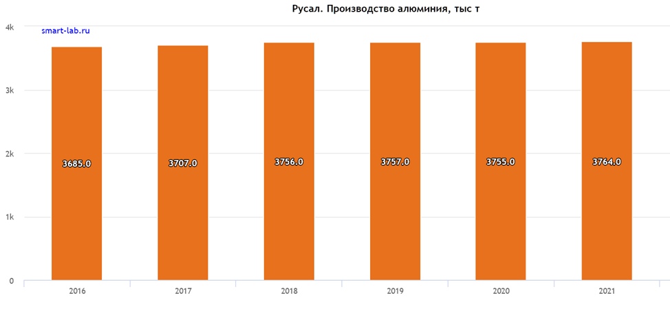 Производство же достаточно стабильно. И уже много лет колеблется у уровня 3,75 млн тонн алюминия в год.