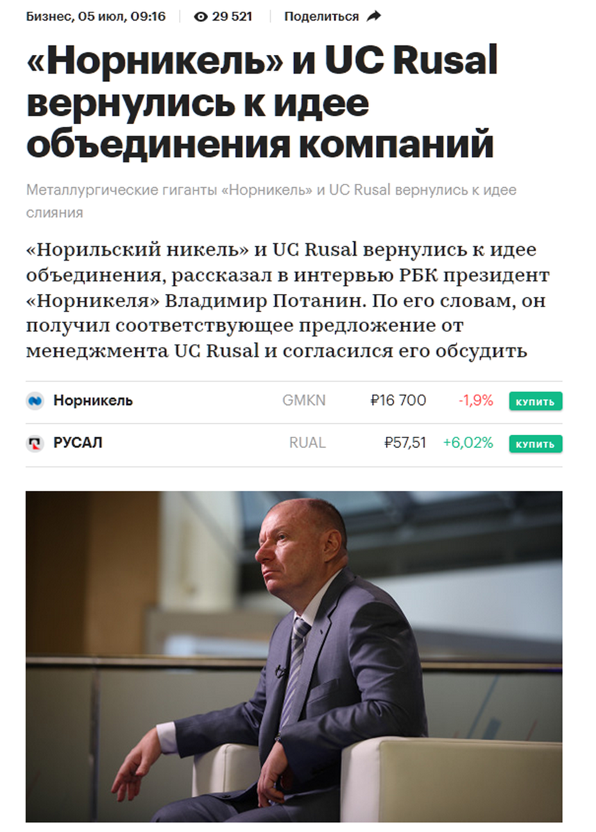 Потеря дивидендов от НорНикеля может быть очень негативным для РУСАЛа, поэтому они вновь предложили Потанину объединится. Для РУСАЛа это будет довольно позитивно, т.к. долг размажется и на НорНикель. А вот зачем это НорНикелю до конца не очень понятно. Какой-то очевидной выгоды от синергии не видно. Впрочем пока окончательного решения нет.