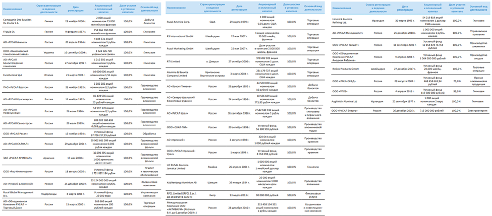 РУСАЛ кроме НорНикеля и Русгидро (в Русглиро доля большая, но не контролирующая) напрямую или косвенно контролирует деятельность большого числа дочерних компаний из разных стран и сфер деятельности.