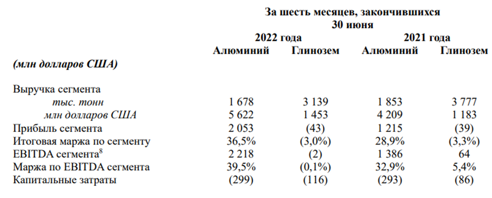 Относительно 1П 2021, выручка выросла на 31% до $7,15 млрд. По большей части это объясняется ростом цена на алюминий на Лондонской бирже. Средняя цена продажи алюминия в первом полугодии 2022 года составила 3 365 долл. (+47,1% г/г).