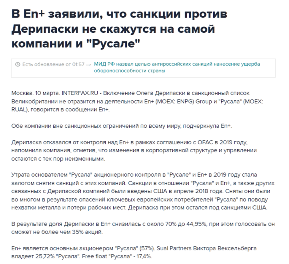 10.03.22 РУСАЛ сообщил, что включение Дерипаски в санкционный список не отразится на деятельности Компании.