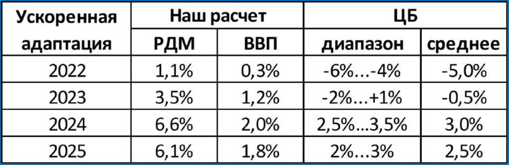 Таблица 2. В нашем сценарии “Ускоренная адаптация” ВВП растёт чуть быстрее в 2025 году