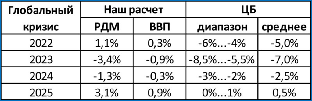 Соответственно, наш прогноз (см. таблицу умножения ВВП выше) тоже предполагает небольшое падение ВВП в эти годы (таблица 3).
