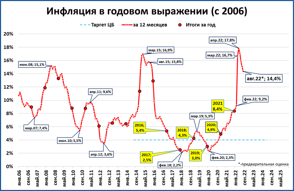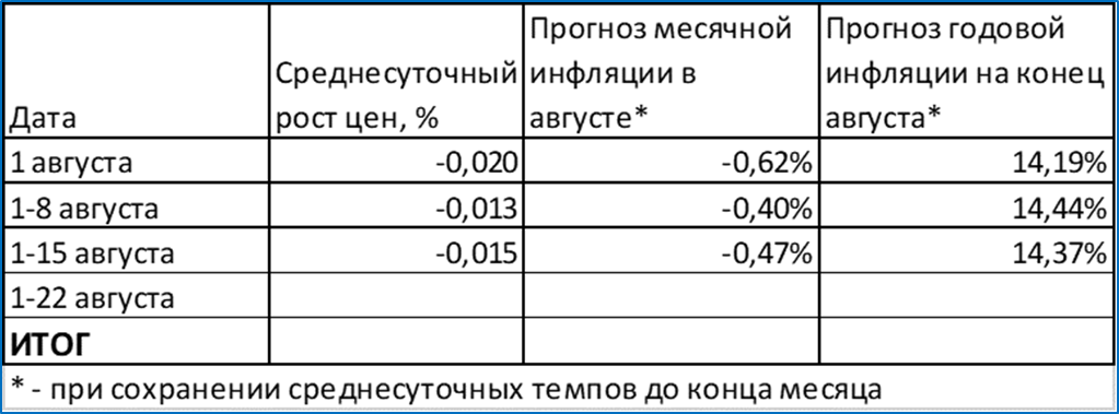 Прогноз годовой инфляции сохраняется на уровне 14,4% по итогам августа.