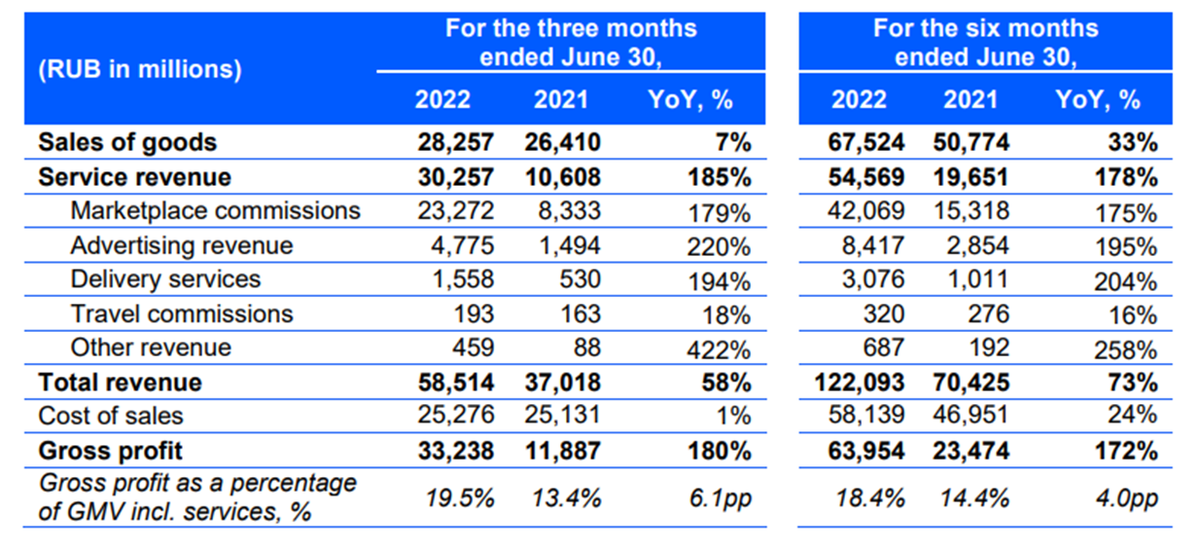 Итак, Выручка за квартал выросла на 58%, а за полгода на 73% до 122 млрд рублей.