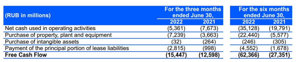 Дополнительно к этому прибавим капитальные затраты в размере 7,2 млрд и платежи за аренду 2,8 млрд. В итоге получился отрицательный чистый денежный поток в 15,6 млрд за квартал. А за полгода он составил -62,3 млрд. Это не самые приятные цифры для инвестора. Озон - это машина генерирующая отрицательный денежный поток.