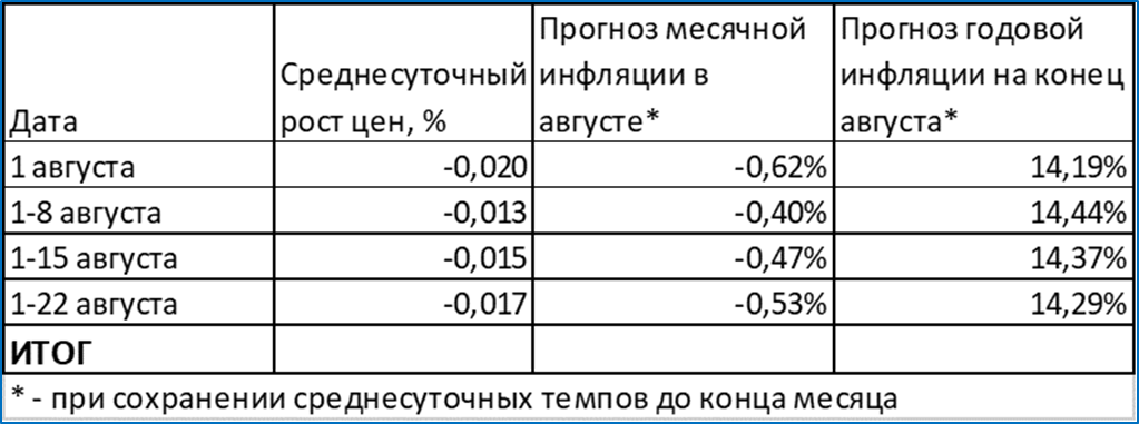 Прогноз инфляции по итогам августа на основе недельных данных мы понизили до 14,3% годовых (с 14,4% неделей ранее).