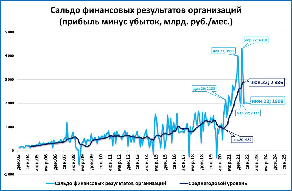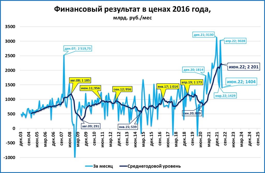Среднегодовой финансовый результат снизился, но остаётся вблизи рекордных уровней (тёмно-синяя линия).
