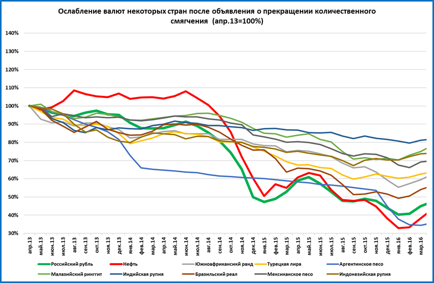 Когда ФРС весной 2013 года объявила о предстоящем в 2014 году сворачивании количественного смягчения, валюты развивающихся стран отреагировали на это снижением.