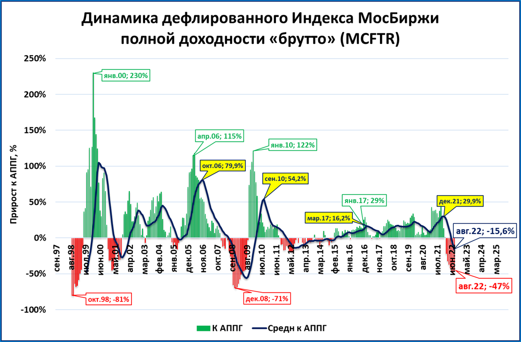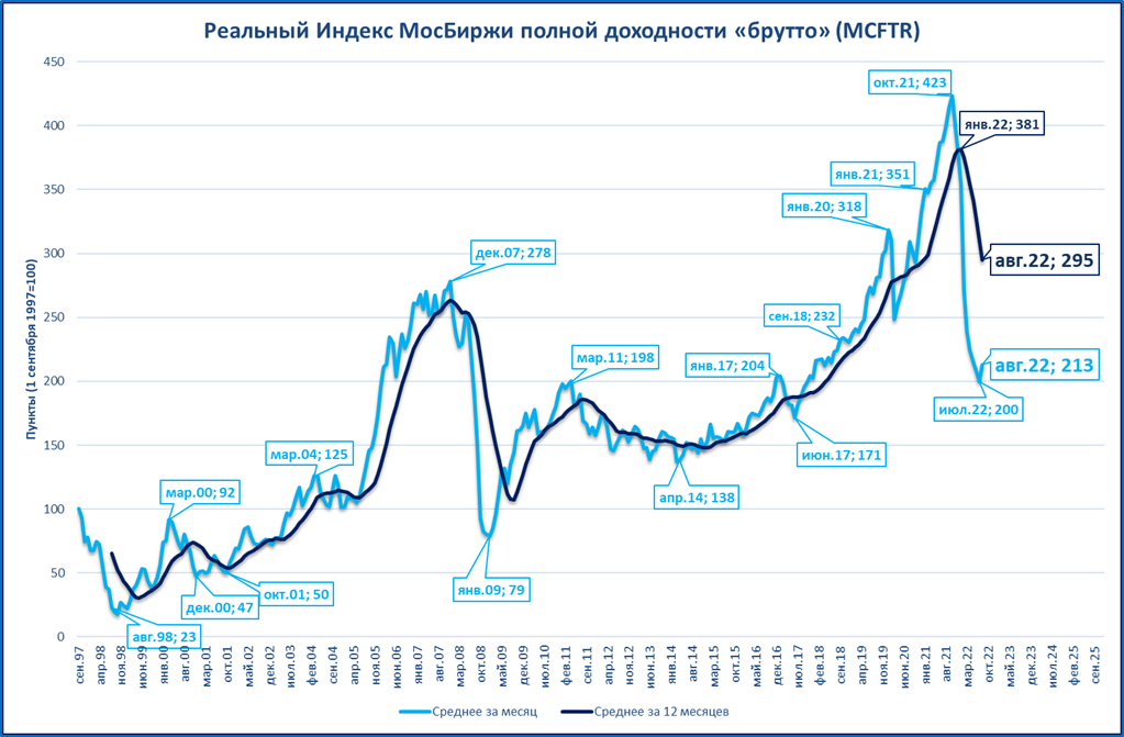 Если учесть дивиденды, выплачиваемые по акциям, а также учесть инфляцию, то по итогам июля такой “реальный индекс полной доходности” Мосбиржи составит 213 пунктов (сентябрь 1997 = 100).
