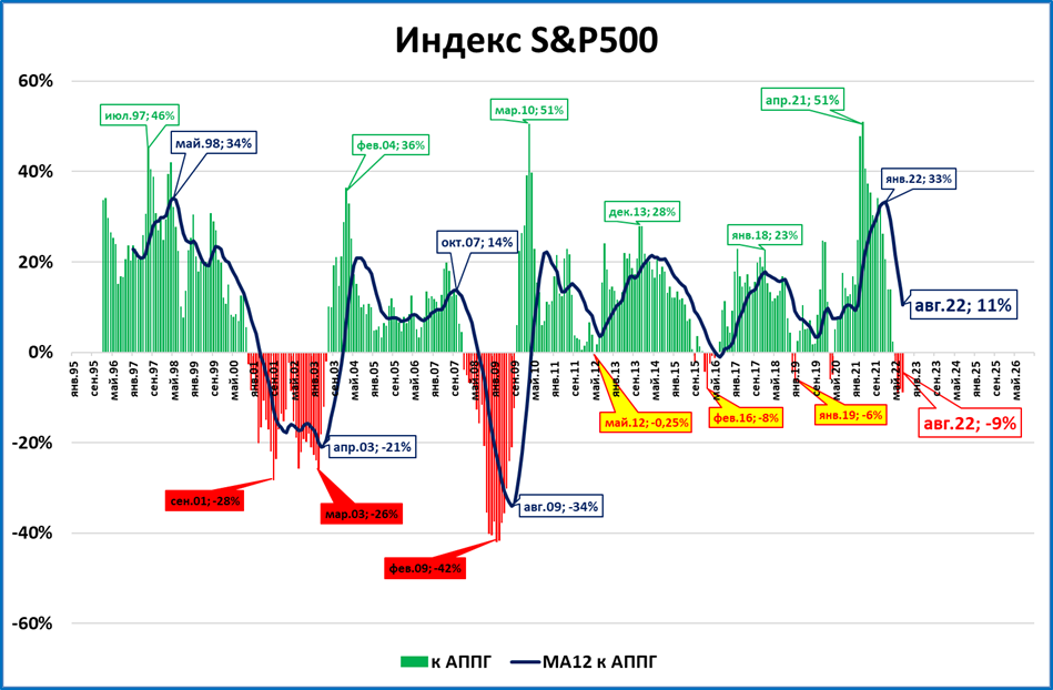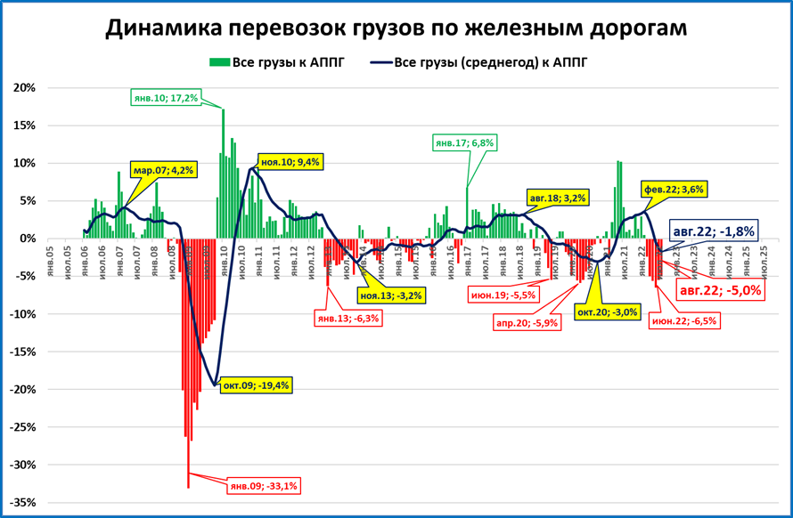 Показатель интересен тем, что замедления темпов (см. синюю линию и жёлтые выноски на графике) зачастую заранее предупреждают о замедлении темпов и даже о падении ВВП.