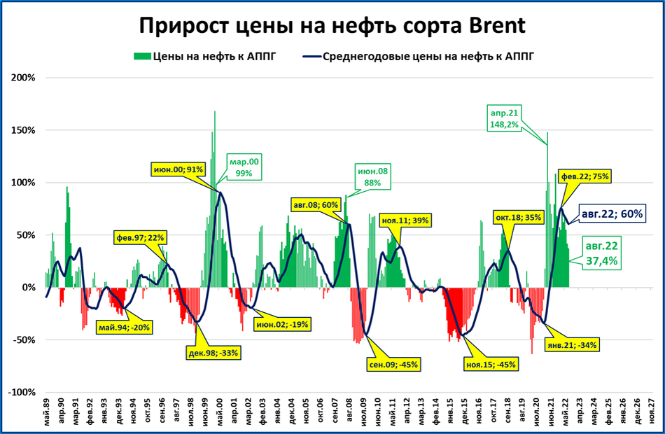 В августе цена нефти Брент снизилась до 97 долларов (104 в июле). Среднегодовые цены (синяя линия) на максимальных с января 2015 года уровнях.