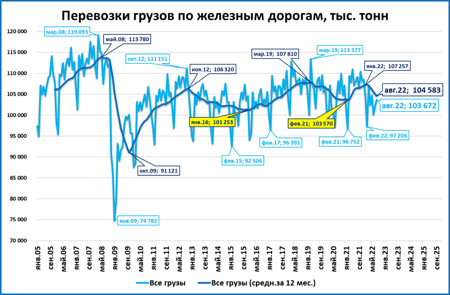 Среднегодовой объём перевозок продолжает падать с января 2022 года, но пока находится выше кризисных минимумов 2016 и 2021 годов (см. жёлтые выноски).
