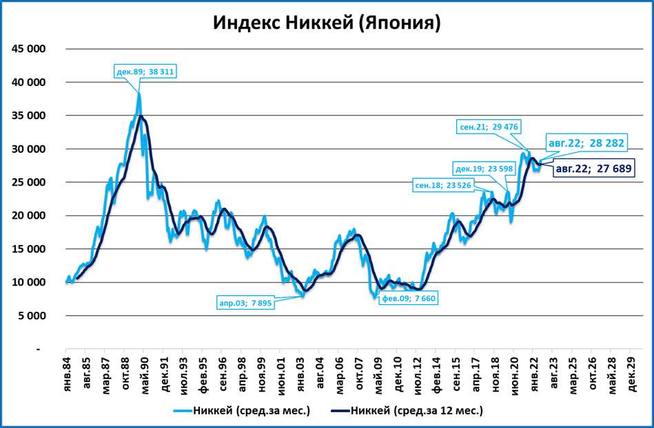 Индекс японского фондового рынка Никкей в августе составил 28,3 тыс. пунктов.