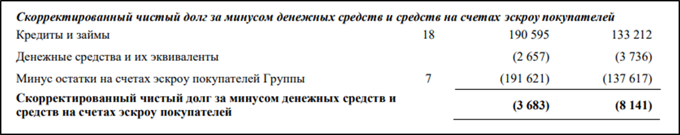 Денежных средств на счетах, относительно долга не так много, - всего 2,6 млрд. Но для учёта чистой долговой нагрузки, нужно учитывать остатки на эскроу счетах. С их учётом у Самолета отрицательный чистый долг. Т.е. финансовое состояние можно условно назвать довольно устойчивым. Весь долг обеспечен реальныйми деньгами покупателей.