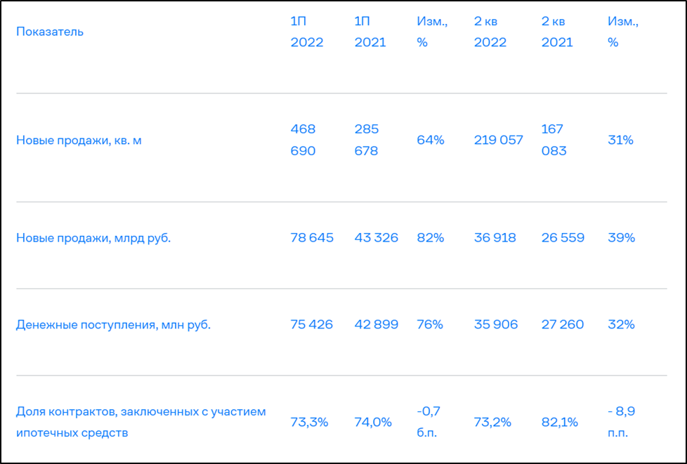 Успешные результаты первого полугодия и восстановление спроса в сегменте доступного жилья на фоне снижения ипотечных ставок и расширения мер государственной поддержки позволяют самой компании прогнозировать, что по итогам 2022 года в сегменте первичной недвижимости они смогут продать более 1,3 млн квадратных метров на сумму, превышающую 200 млрд рублей, а EBITDA, превысит 65 млрд рублей.