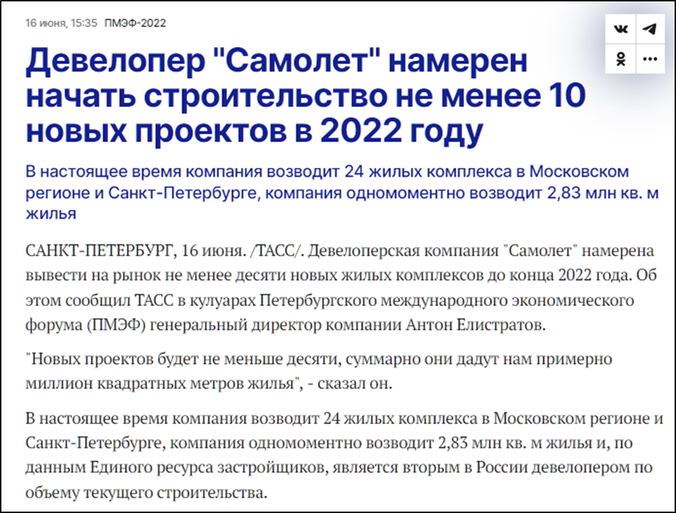 В 2022 году компания намерена начать строительство не менее 10 новых проектов на 1 млн кв метров жилья. Это плюс треть к текущему объему строительства.