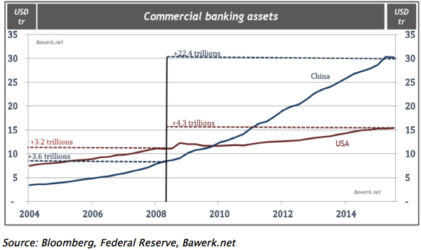 Причина этого в том что, в 2008 году китайцы столкнулись с замедлением темпов роста своей экономики. И они придумали решение: печатать деньги. Но, не просто печатать деньги, а печатать деньги в таких объемах чтобы весь мир заплакал от зависти. С 2008 до 2019 года ФРС напечатал 3 трлн долларов, а китайский ЦБ напечатал юаней на 0,7 трлн долларов, но за счет роста кредитного мультипликатора и за счет снижения уровня обязательных резервов денежная масса (М2) Китая выросла на 15 трлн долларов, а объем активов банковского сектора на 22 трлн. долларов.