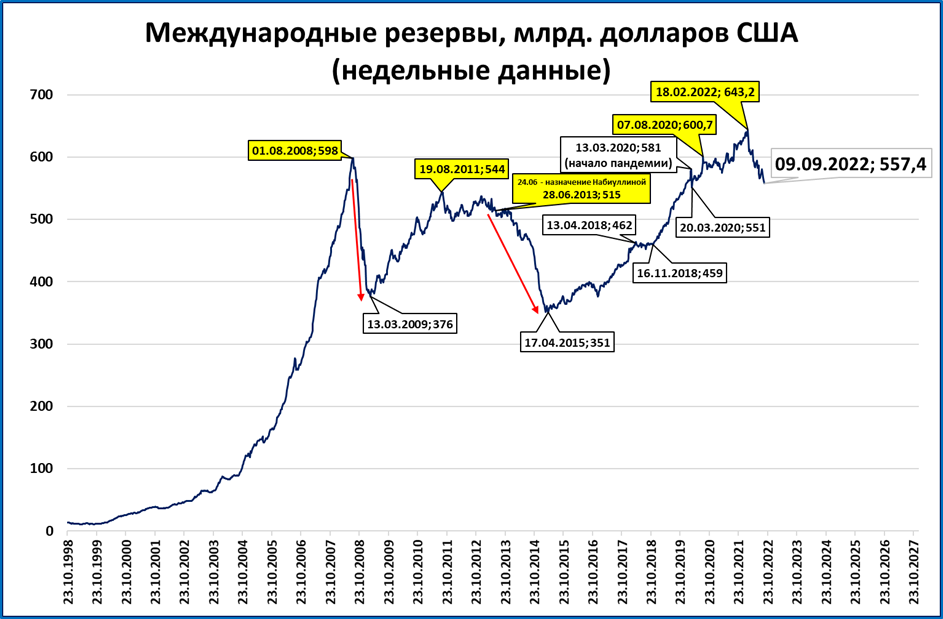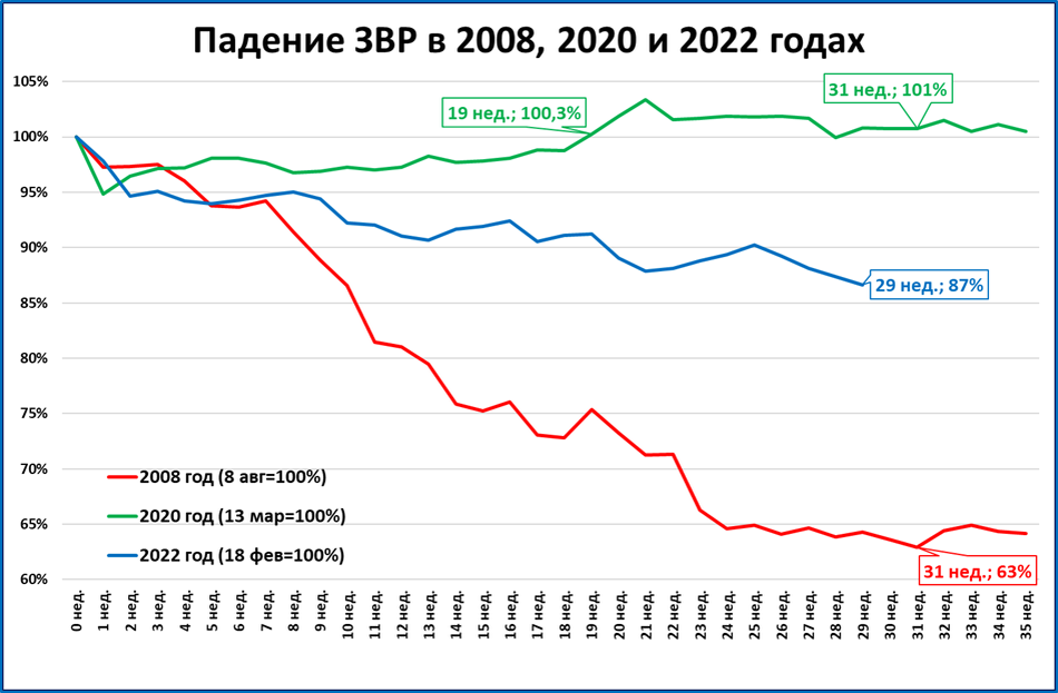 Это минимальное значение с марта 2020 года. От максимума 18 февраля 2022 года ЗВР опустились уже на 13%.