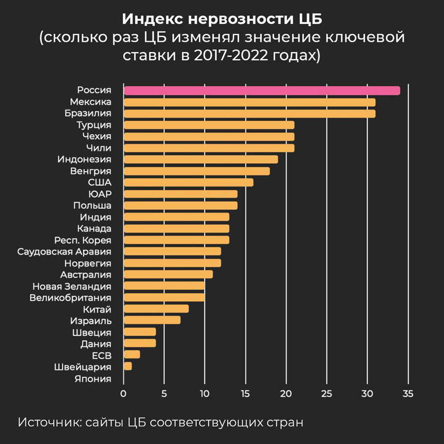Отметим, что по «индексу нервозности» (количеству изменений ставки с 2017 года) российский ЦБ уверенно вышел в мировые лидеры.