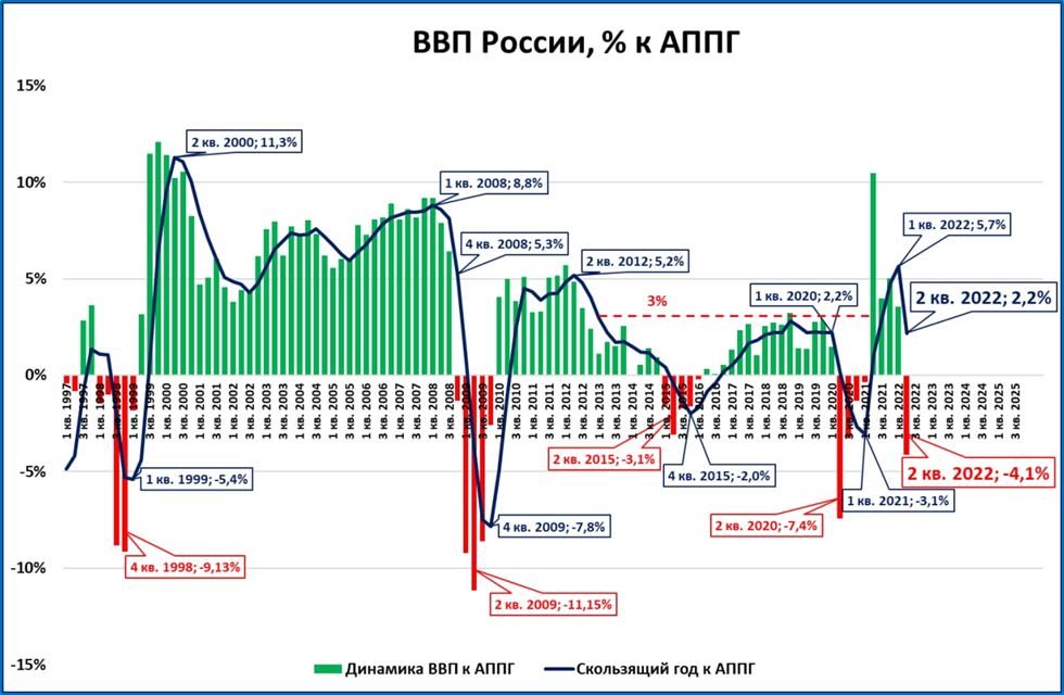 ВВП за 4 квартала (скользящий год) сейчас всё еще выше, чем годом ранее: +2,2%. Темп первого полугодия: -0,4%.