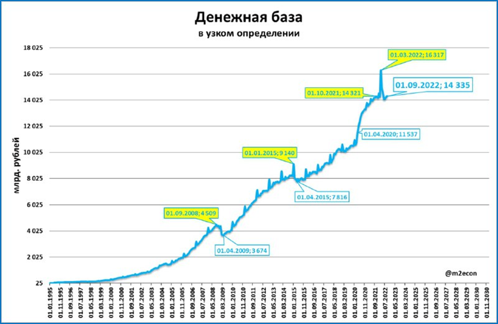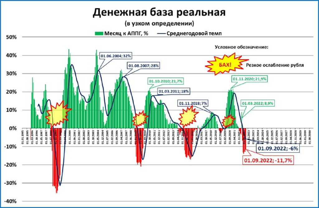 Но это номинальный рост. При инфляции за тот же период 14,1%, в реальном выражении денежная база продолжает сокращаться: -10,4% на 1 сентября.