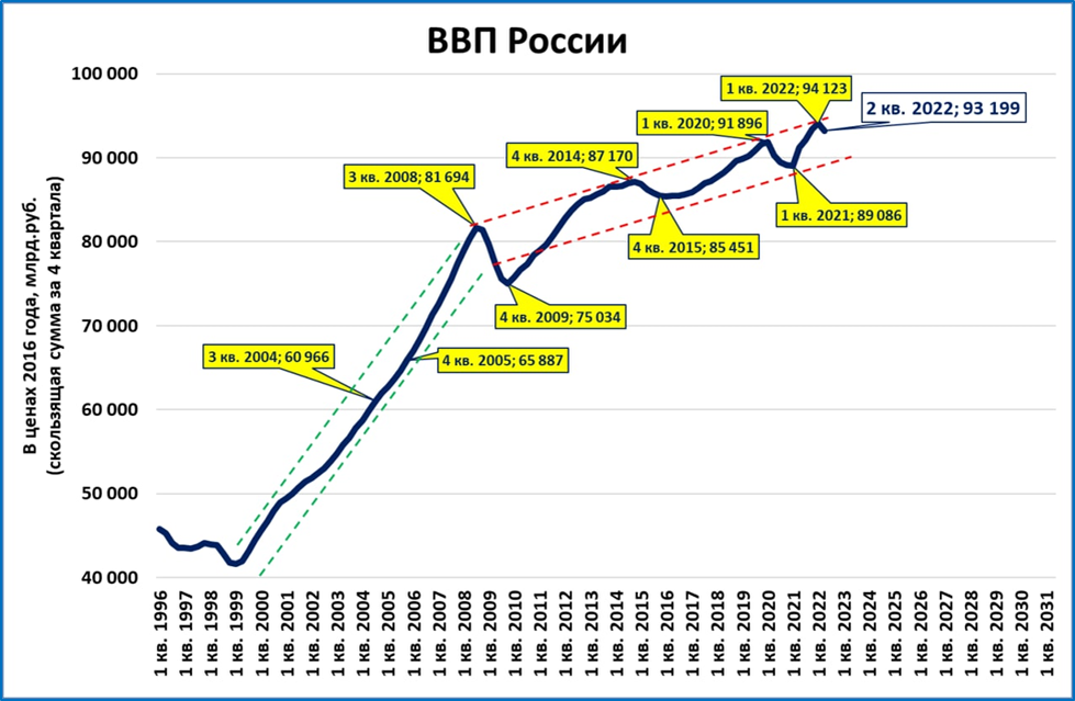 Поэтому четырёхквартальный ВВП (график выше) находится в привычном за последнее десятилетие стагнационном коридоре, даже в его верхней части.