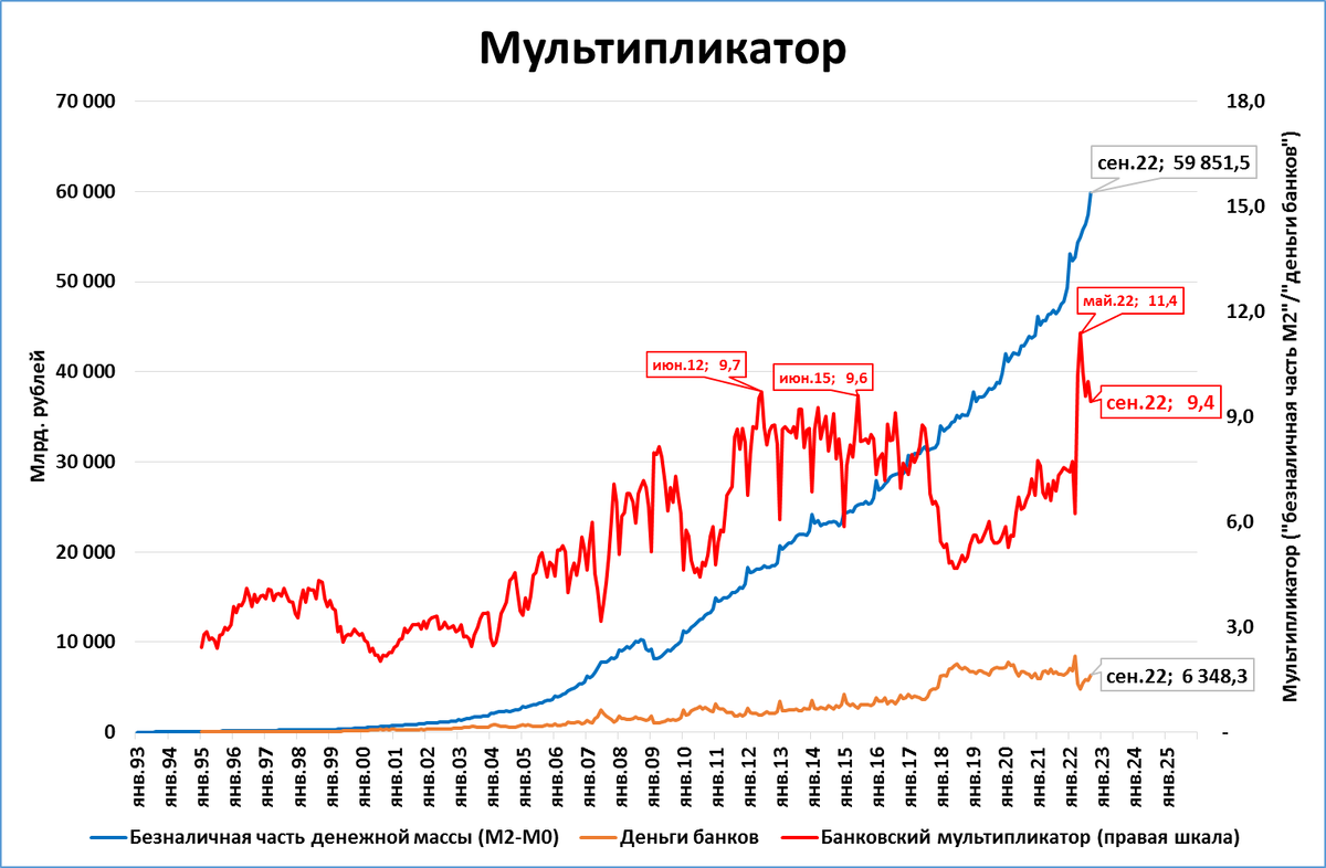 Если в мае на 1 рубль у банков приходилось 11,4 рубля безналичных денег (высокие риски), то сейчас этот мультипликатор уменьшился до 9,4 (риски снизились.