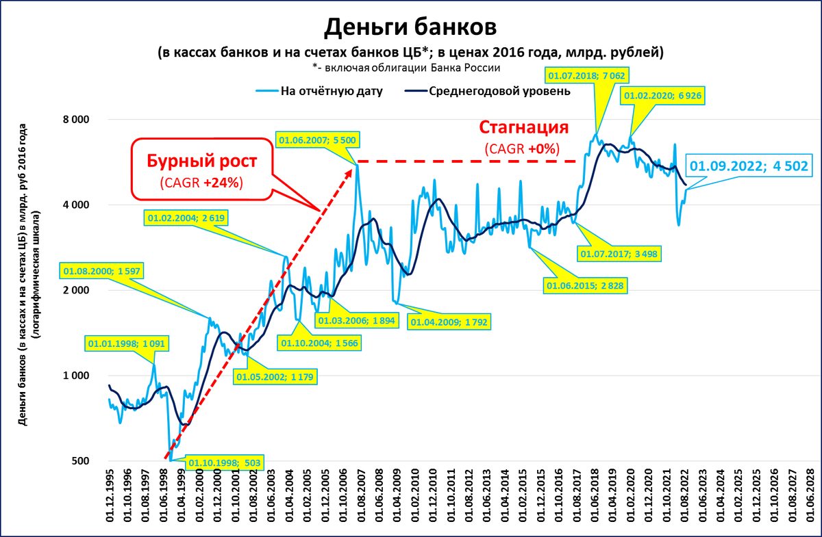 Обратите внимание на график 2: деньги банков в реальном выражении застыли на уровне 2007-2008 годов. Это одна из причин стагнации экономики России в последние 12 лет.