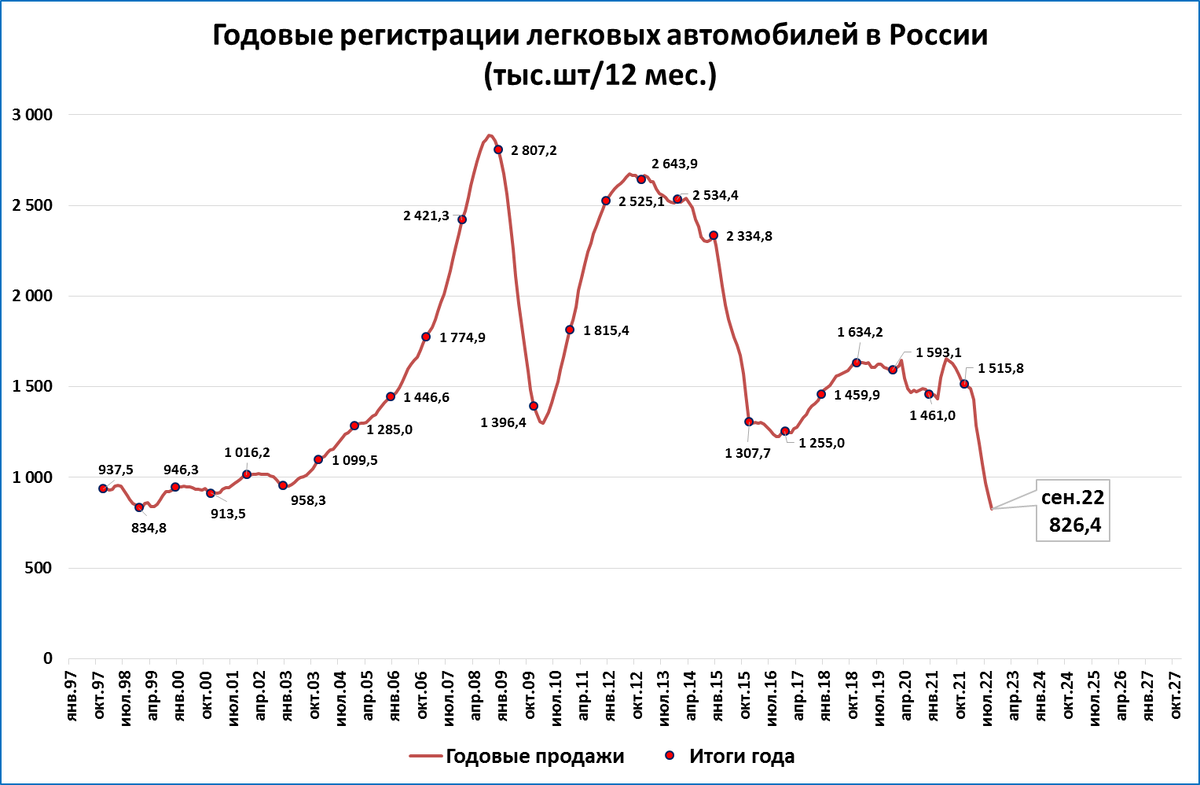 Продажи за 12 месяцев (скользящий год) опустились до 826,4 тыс.