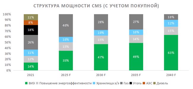Компания перенесла срок закрытия угольных ТЭС с 2039 на 2025 год. Мощность останавливаемых угольных станций (1,88 ГВт) будет закрыта за счет новых газовых ТЭС (2,18 ГВт), а долгосрочной ставкой компании станут ВИЭ — до 2040 года CMS планирует ввести 8 ГВт СЭС.