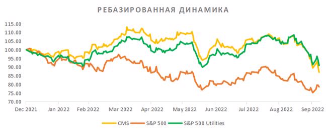 Акции CMS с начала 2022 года упали на 13%, отстав от динамики отраслевого S&P 500 Utilities, который снизился на 9% за тот же период. Оба инструмента смотрятся лучше широкого рынка в лице S&P 500, который просел на 21%.