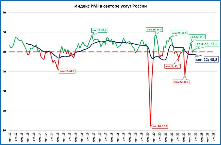 В услугах индекс тоже вышел в позитивную зону (>50 пунктов). Напомним, что в августе индекс опускался ниже 50 пунктов (49,9).