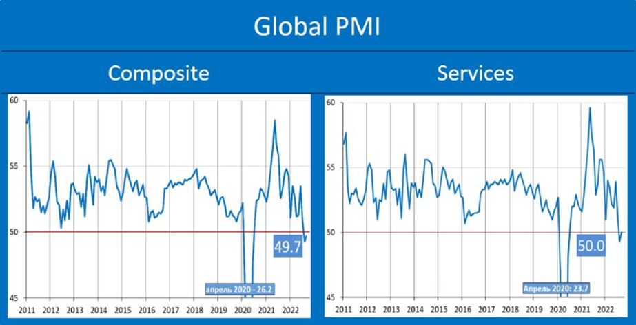 ● Глобальный опережающий индекс PMI показывает переход мировой экономики от роста деловой активности к её снижению.