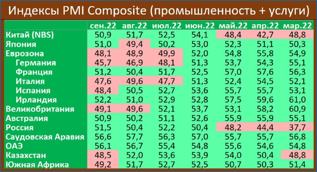 В США индексы от разных организаций (S&P и ISM) показывают разную динамику, но оба находятся в позитивной зоне, то есть выше 50 пунктов.